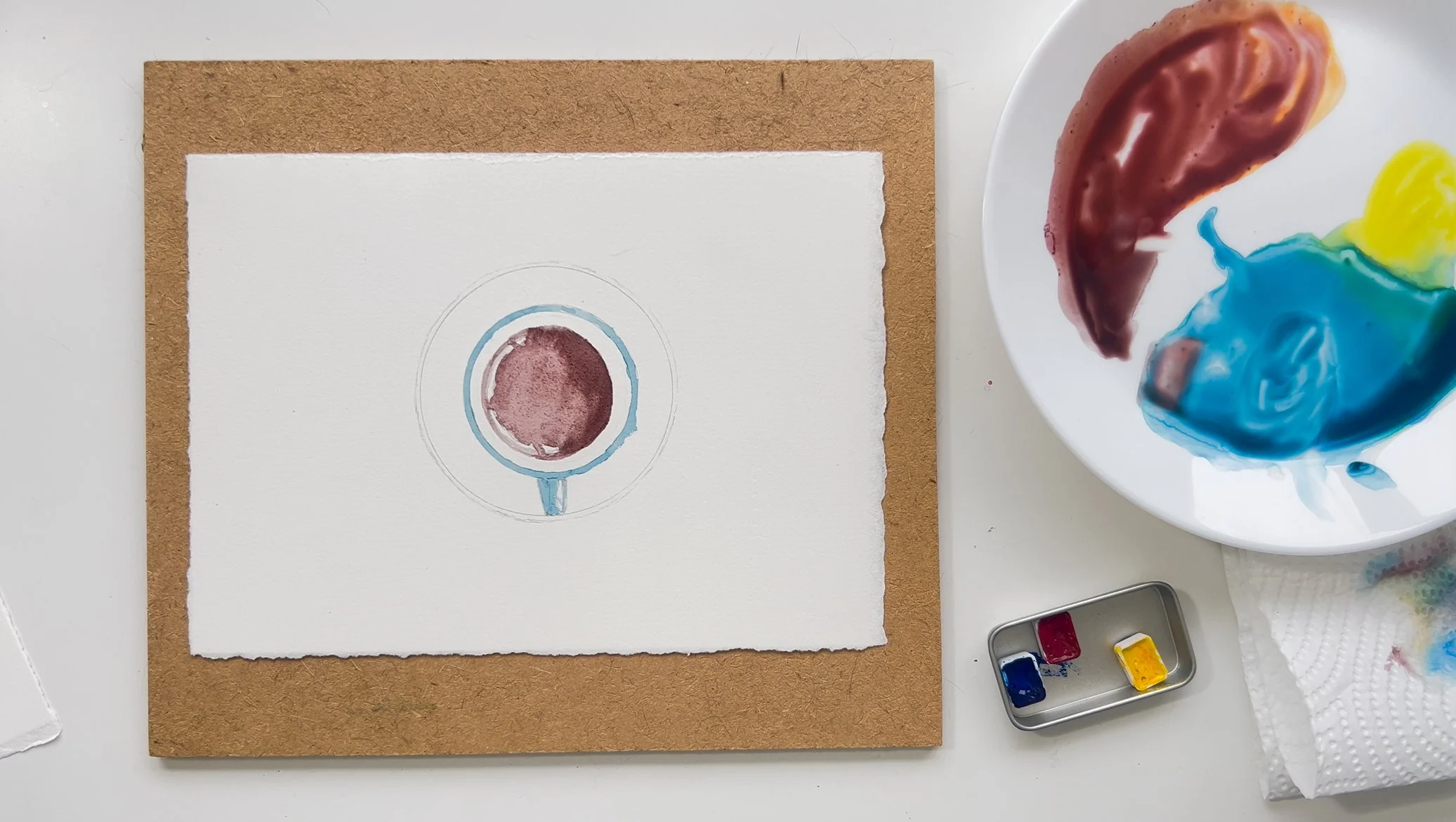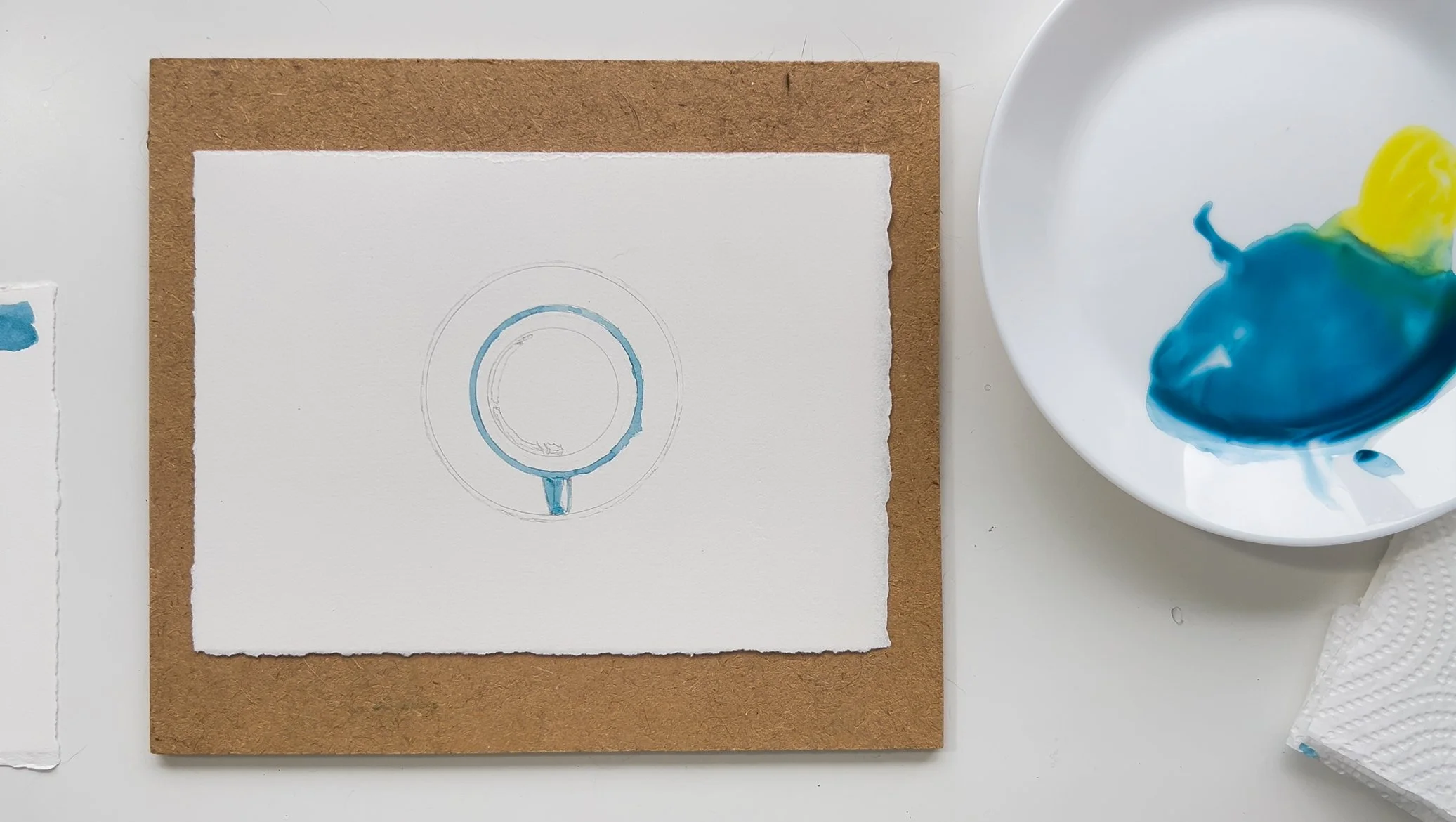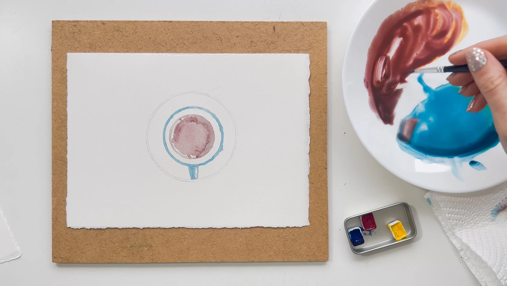 Step 2. Mix the colour, I used a blue green colour. Use any colour you wish. I then used the wet on dry technique to paint the rim of the cup and the handle. I left a small white mark on the handle to represent light coming in from the right.