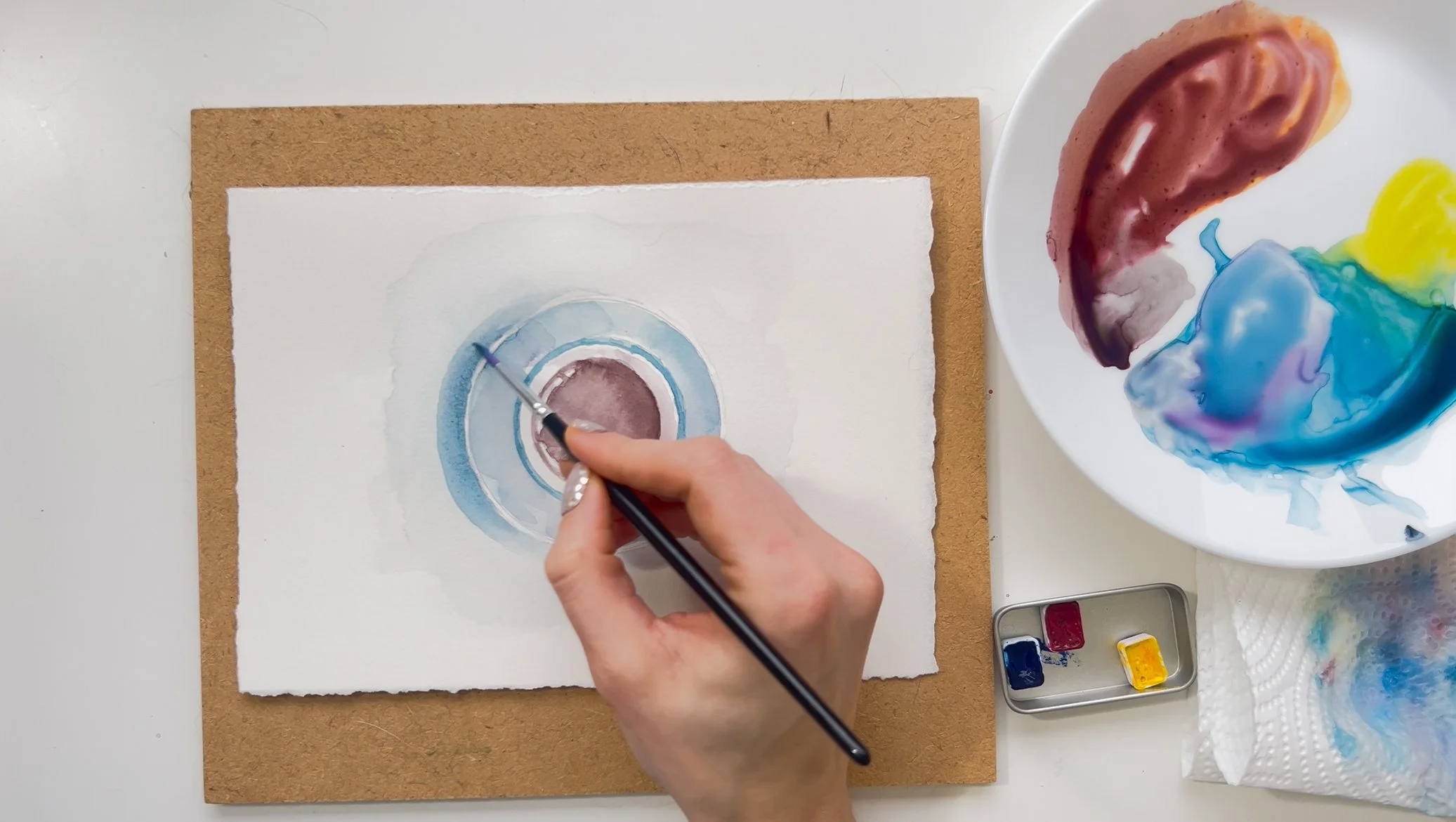 Step 3. Mix a brown - mix orange first and then add a touch of blue to it. Use the same technique to paint the most inner circle of the cup. Leave white spots to represent light.