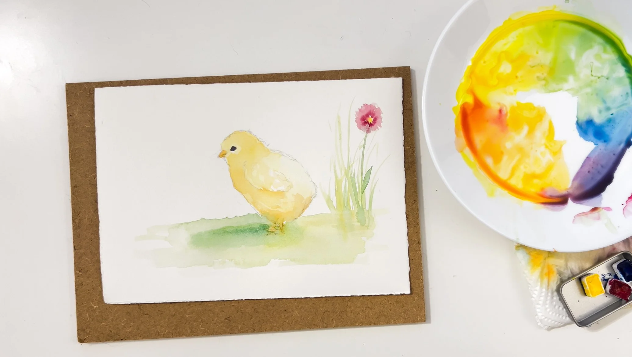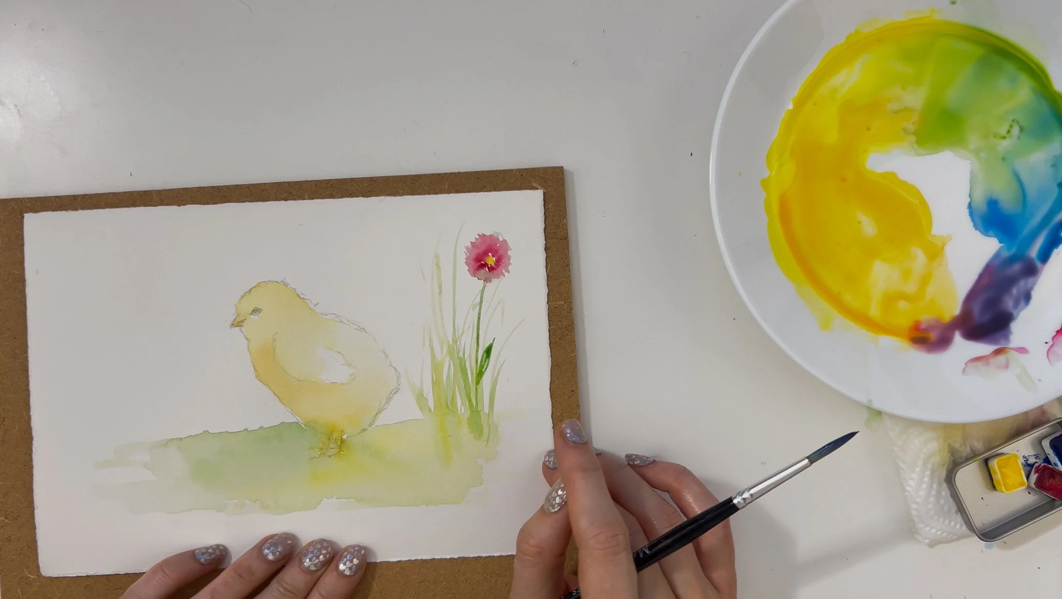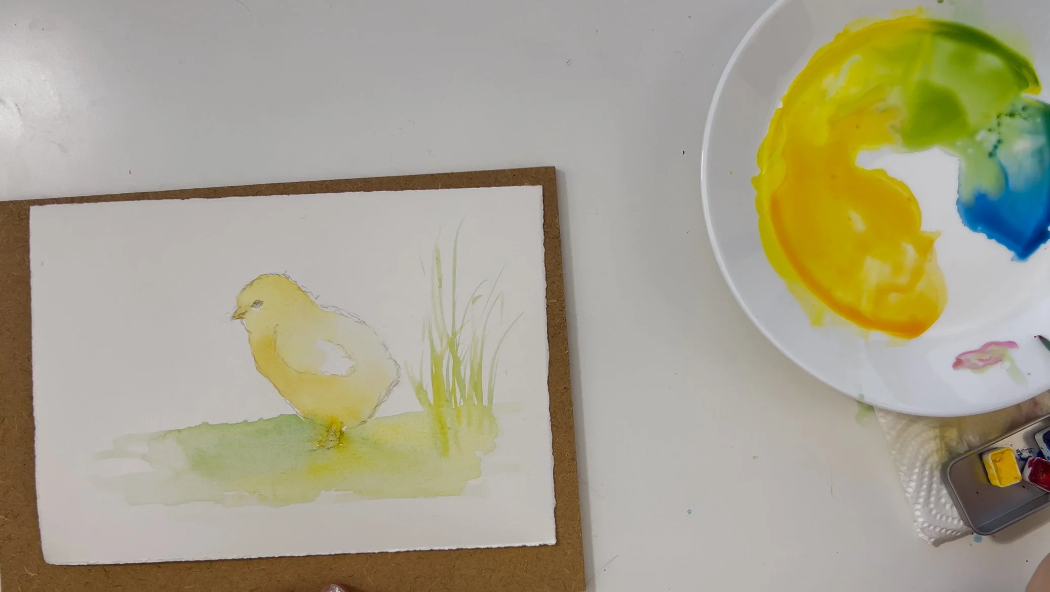 Step 6. Add more darker layers to certain areas of the painting - underside of the chick and the grass beneath it. All finished!