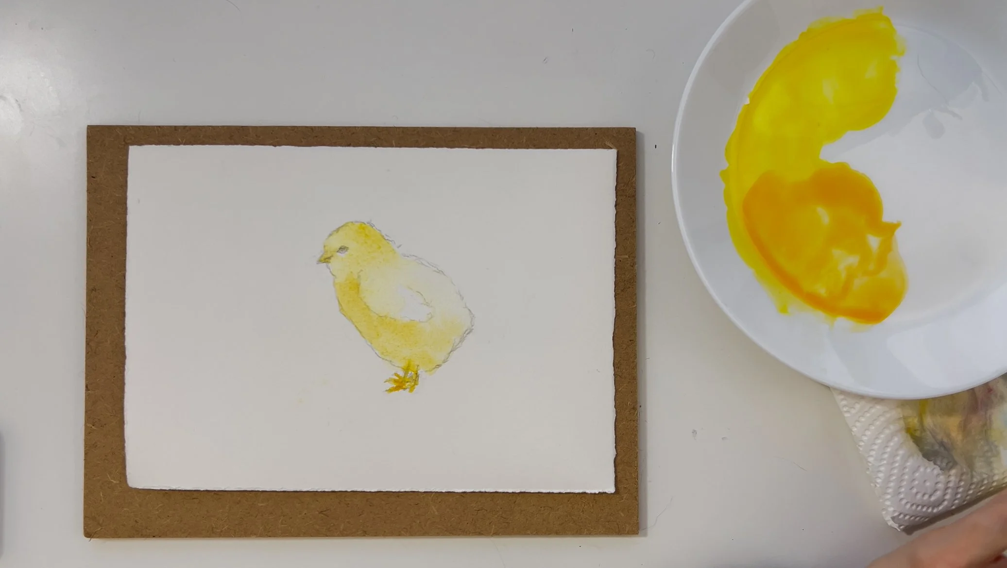 Step 2. Use yellow and then mix an orange. Use the wet on dry technique and add a light layer to the chick. Use the orange for the beak, feet and the underside of the chick.