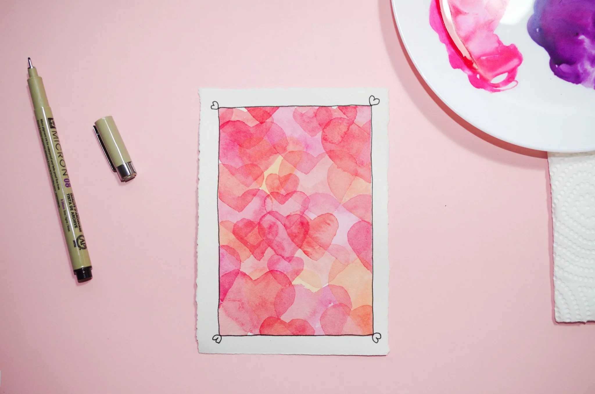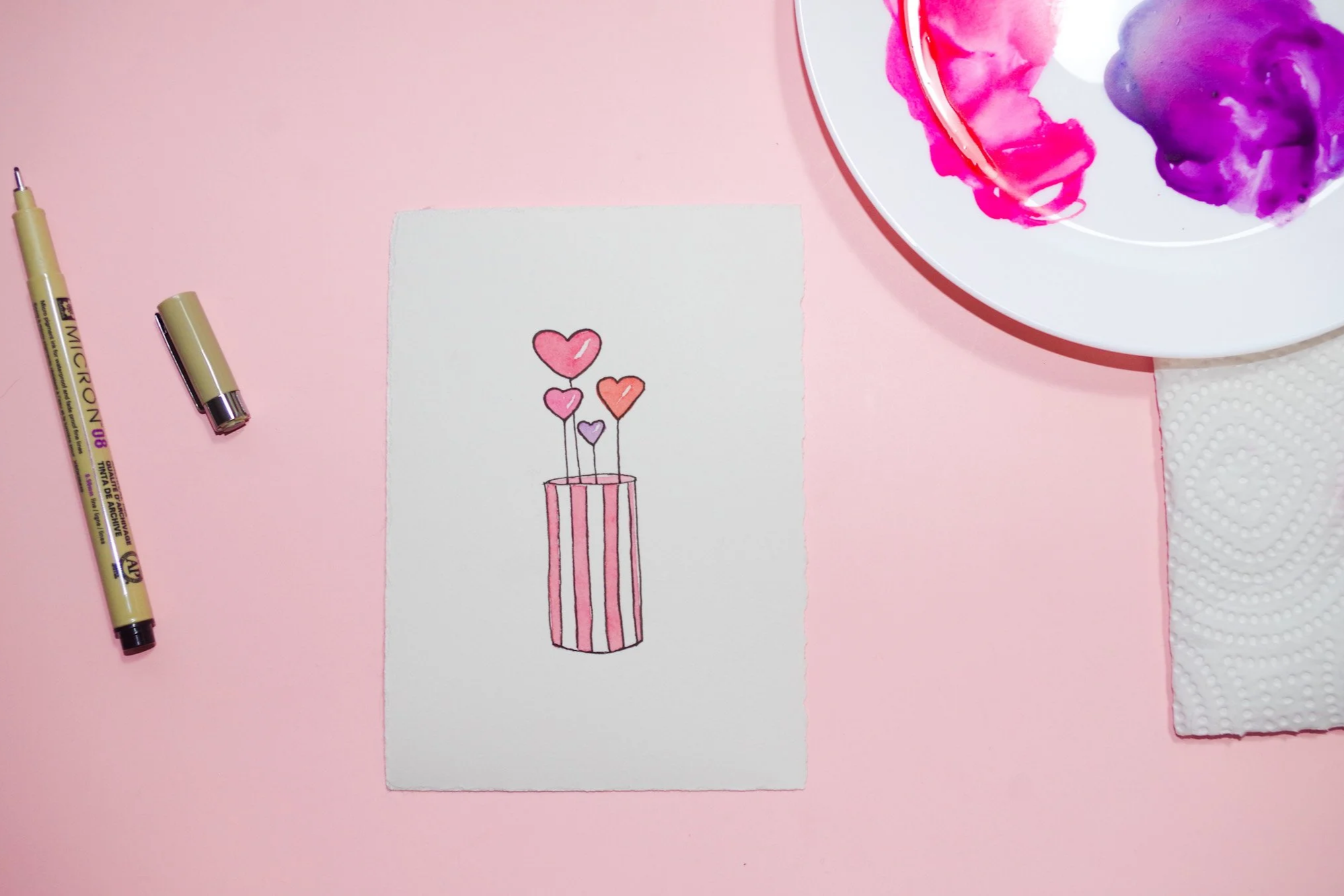 You can use what you have at home. You will need watercolour paint, watercolour paper, one round brush, and a fineliner. Masking tape is recommended. A full materials list is included inside the course as a video and a downloadable PDF.